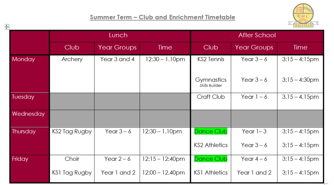 Below is the timetable for the clubs available at Richard de Clare and the letter detailing information for you to book a place for your child.